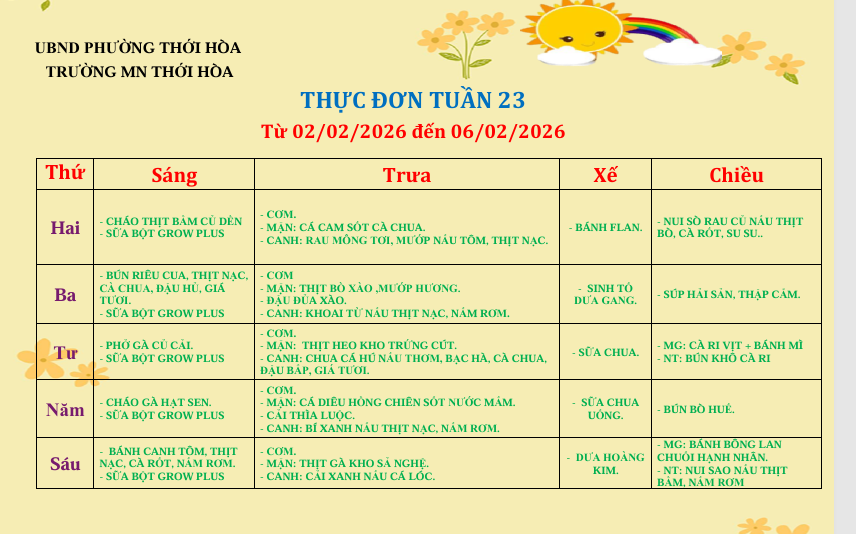 Thực đơn tuần 23: Từ ngày 02/02/2026 đến 06/02/2026