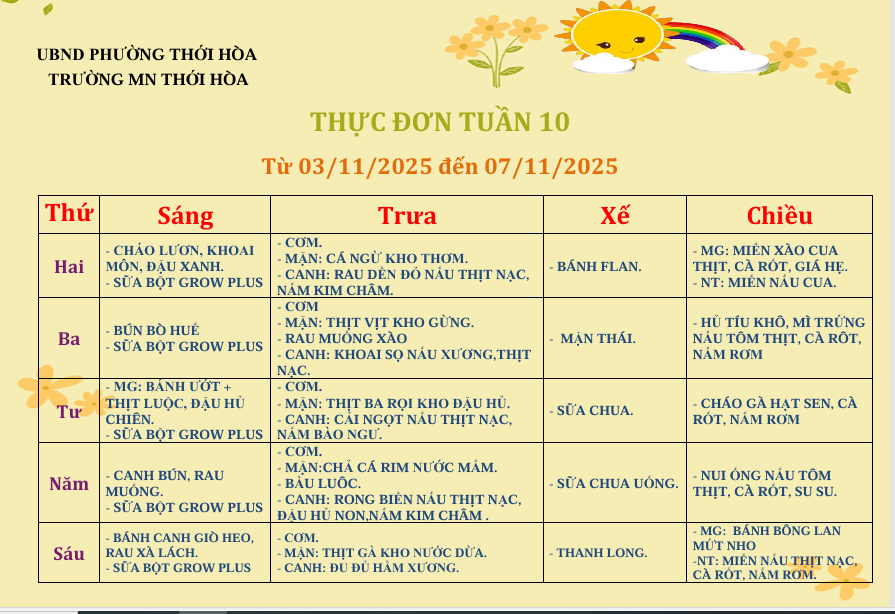 Thực đơn tuần 10 (Từ ngày 03/11/2025 đến 07/11/2025)