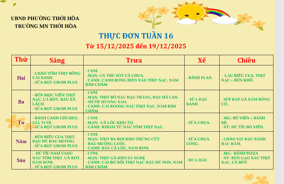 Thực đơn tuần 16: Từ ngày 15/12/2025 đến ngày 19/12/2025