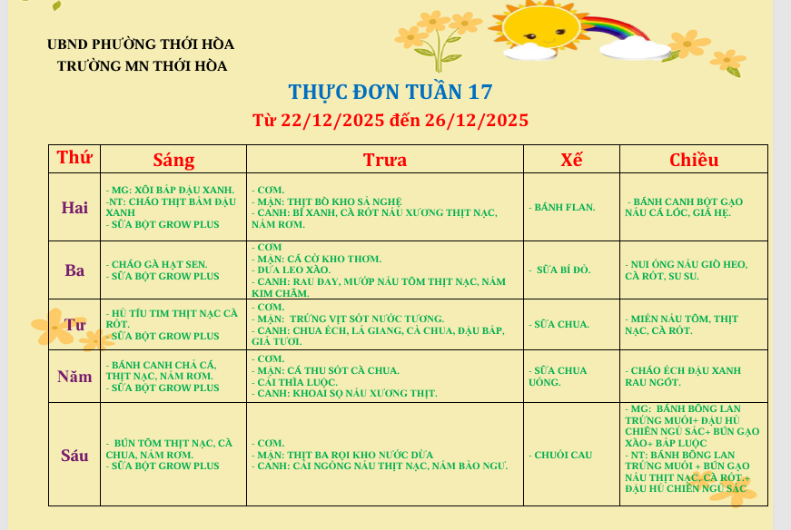 Thực đơn tuần 17: Từ ngày 22/12/2025 đến ngày 26/12/2025