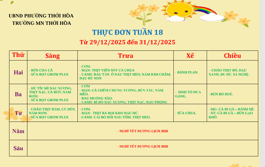 Thực đơn tuần 18: Từ ngày 29/12/2025 đến 31/12/2025