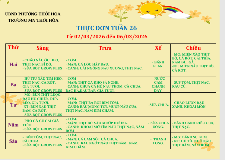 Thực đơn tuần 26: Từ ngày 02/03/2026 đến ngày 06/03/2026