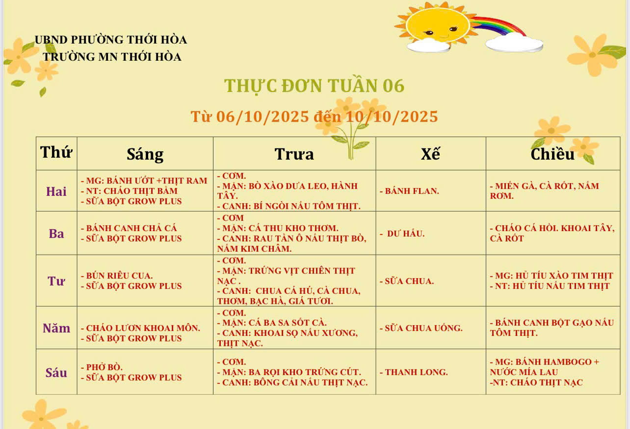 Thực đơn tuần 6: Từ ngày 06/10/2025 đến 10/10/2025